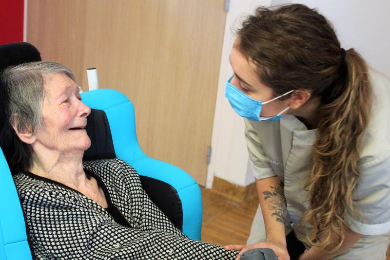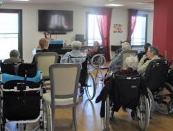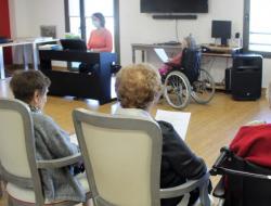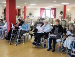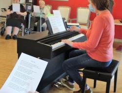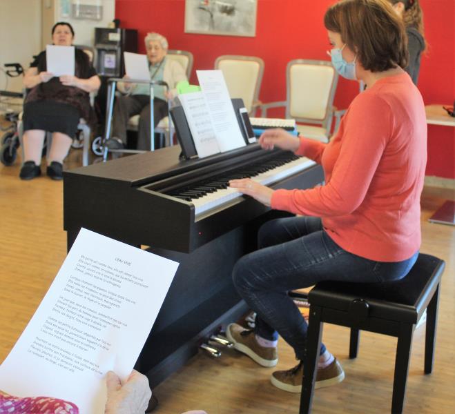 Afin de démarrer la journée avec positivité, et avec ce beau soleil matinal, nous avons pris place pour une heure de chant avec Éloïse. Professeure de chant et de musique, Éloïse intervient une fois par mois pour proposer un temps de chorale aux résidents.
