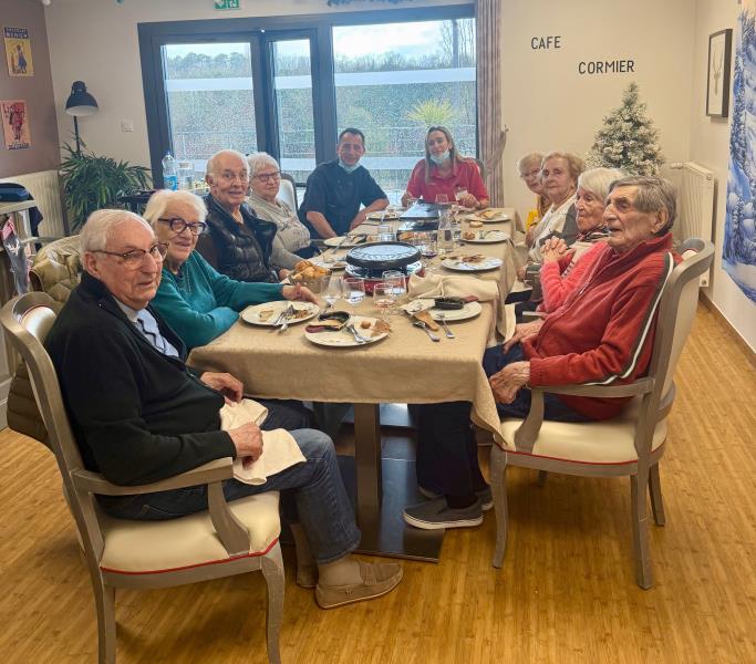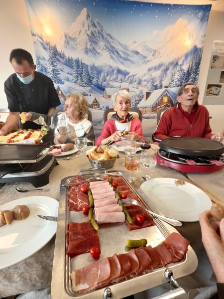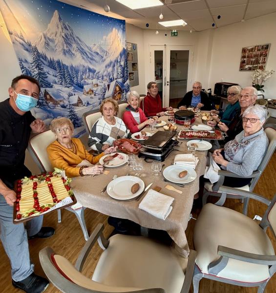 Quelques résidents ont profité d'une raclette en petit groupe au salon Cormier. Un moment convivial et gourmand partagé en compagnie de notre Chef Cuisinier Hervé, fidèle à  sa bonne humeur habituelle. D'autres résidents auront le plaisir de partager une raclette dans les prochains jours.