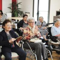Publiée le 12/05/2022Ce matin, les résidents du Clos Lafitte ont eu l'occasion de découvrir l'atelier musique. Eloïse, professeur de chants et musique, avait tout d'abord apporté tout un panel de petits instruments de musique. Puis, nous avons pu suivre le rythme d'une banda avec les claves et tambourins avant de finir par quelques chants.& [...] Lire la suite