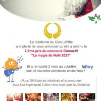 Publiée le 04/02/2022La résidence du Clos Laffitte a remporté le deuxième prix du concours La Magie de Noël 2021 sur plus de 170 résidences, pour l'ensemble des actions menées durant les fêtes de fin d'année. La belle ambiance va se poursuivre autour de l'application Juke Boxe Wivy remportée par la résidence. Ç [...] Lire la suite