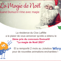 Publiée le 07/02/2022Suite à la participation au concours national de la Magie de Noël organisé par le groupe DomusVi, l'équipe du Clos Lafitte et les résidents sont fiers d'annoncer avoir remporté la deuxième place du classement ! Après avoir réalisé un marché de Noë [...] Lire la suite