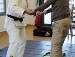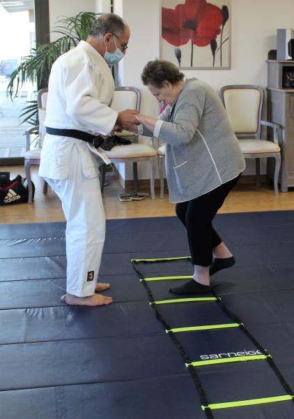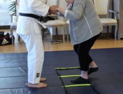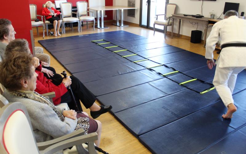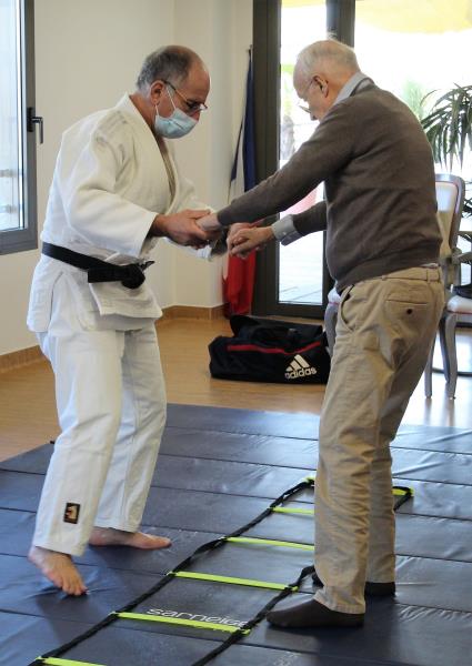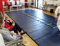 L'atelier est réalisé par Patrick, professeur de judo, qui propose des exercices d'équilibres et de renforcements musculaires sur des tapis.