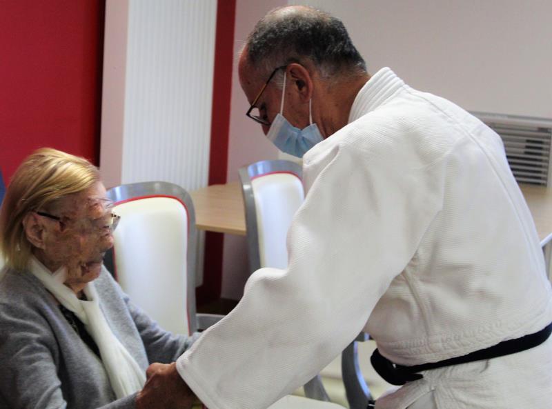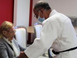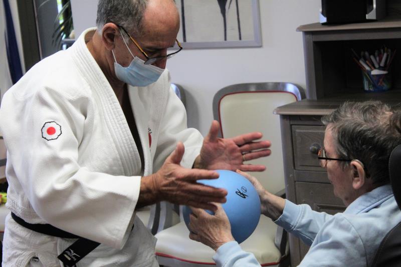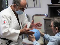 L'atelier est réalisé par Patrick, professeur de judo, qui propose des exercices d'équilibres et renforcements musculaires sur des tapis.
