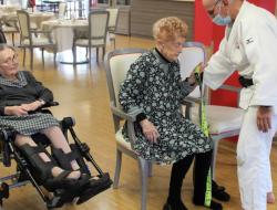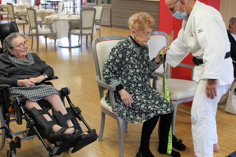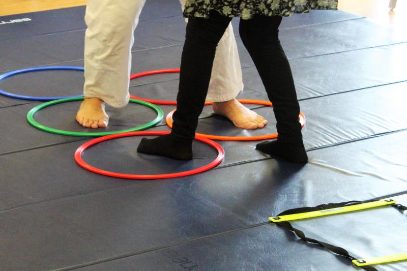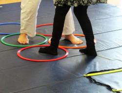 L'atelier est réalisé par Patrick, professeur de judo, propose des exercices d'équilibres et de renforcements musculaires sur des tapis de protection.